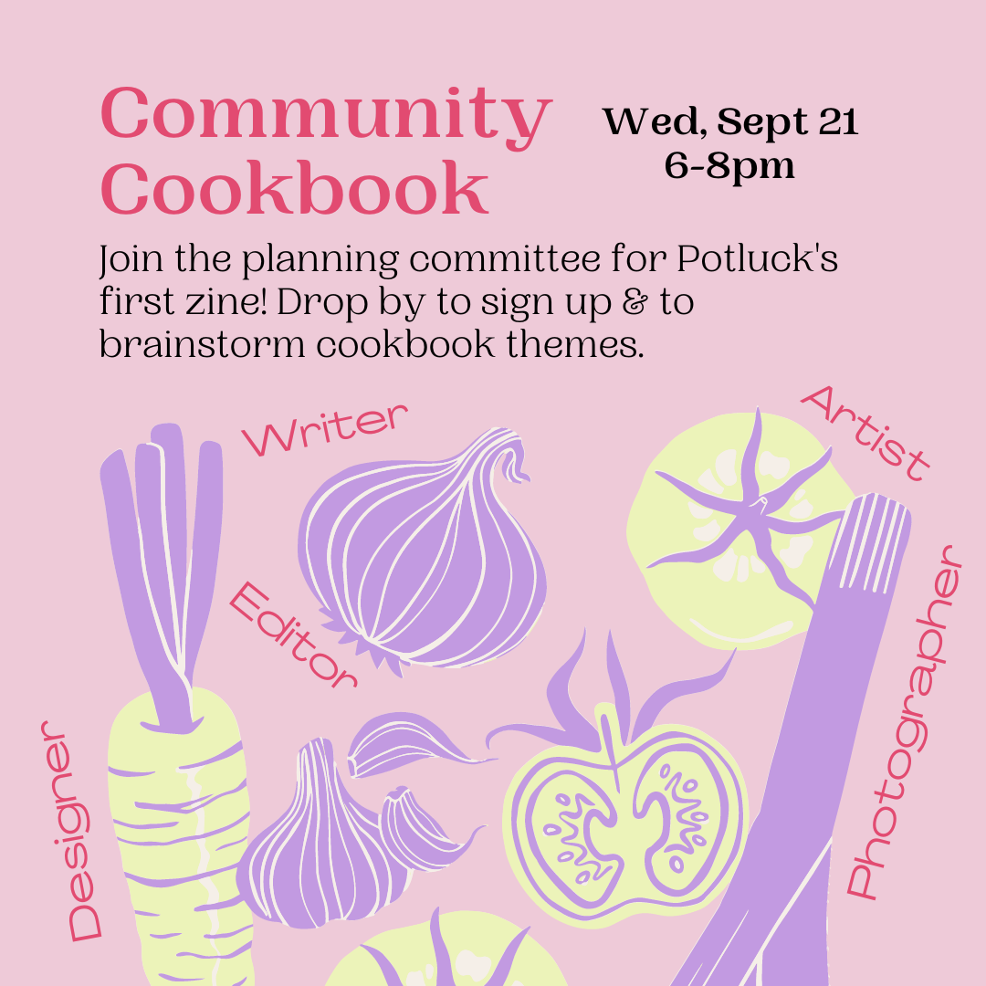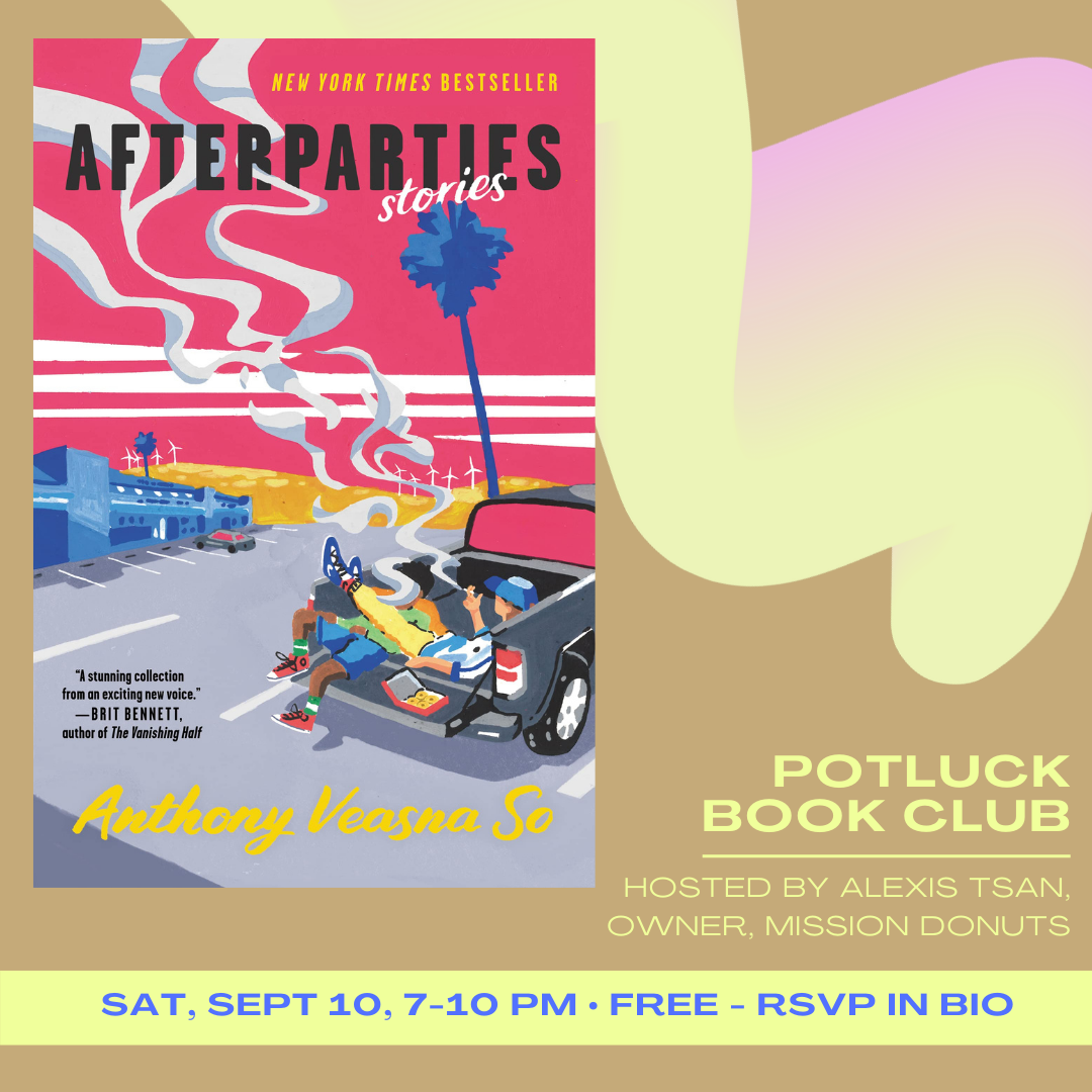 Potluck Potluck is a community events space.We host art shows, book clubs, movie nights, panels and classes.And of course, potlucks. September 10 Book Club "Afterparties" by Anthony Veasna So RSVP Wednesday Walks Weekly morning walks Learn more September 21 Community Cookbook Planning Meeting RSVP October 6 Cinema ClubThe Last Black Man in San Francisco RSVP October 20 Community Stories How I Found Myself in San Francisco Tickets